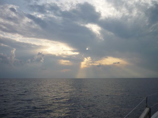 We passed north of the island in the gap between Lipari and Volcano and immediately decided to detour to see a couple of tall rock spires jutting out of the water on the Lipari side of the channel with a backdrop of craggy inlets and natural arches ashore. From there we made a bee-line to the anchorage on Volcano at Porto Ponente. The anchorage was a lot more crowded than we anticipated. We quickly identified the party boat and anchored as far away as possible in the shallows by the black sand beach. The anchorage was beautiful; the volcanic rock had eroded away at the base leaving tall spires and steep mounds jutting into the sky. It looked more like the south Pacific or Indonesian than the Mediterranean (at least to one side of the harbour). The south side of the harbor was filled by the smoldering volcano. We enjoyed a dinner with a stunning and ever changing sunset before retiring for an early night. There was just enough residual cloud from the earlier storms to streak the sky with pink, oranges and reds as the sun dipped below the horizon.