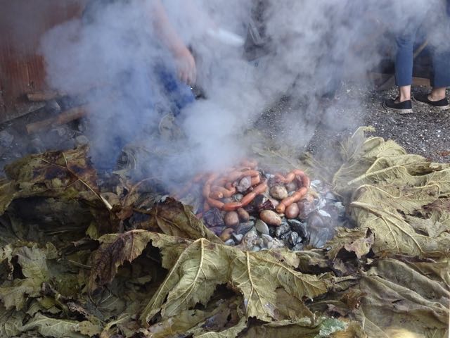 We had passed over a description somewhere, but it is not prepared in too many places, so we never thought we would find it and moved on. Now we were suddenly front row for the big unveiling. Curanto is prepared in a Polynesian-style earth oven dug into the ground. Sizzling hot rocks are put in, topped with clams and mussels. A layer of nalca leaves (a local rhubarb) is put on top. Then comes a layer of pork, nalca, chicken, nalca, potatoes, nalca, bread and more nalca. The whole thing is then left to simmer for two hours or so.